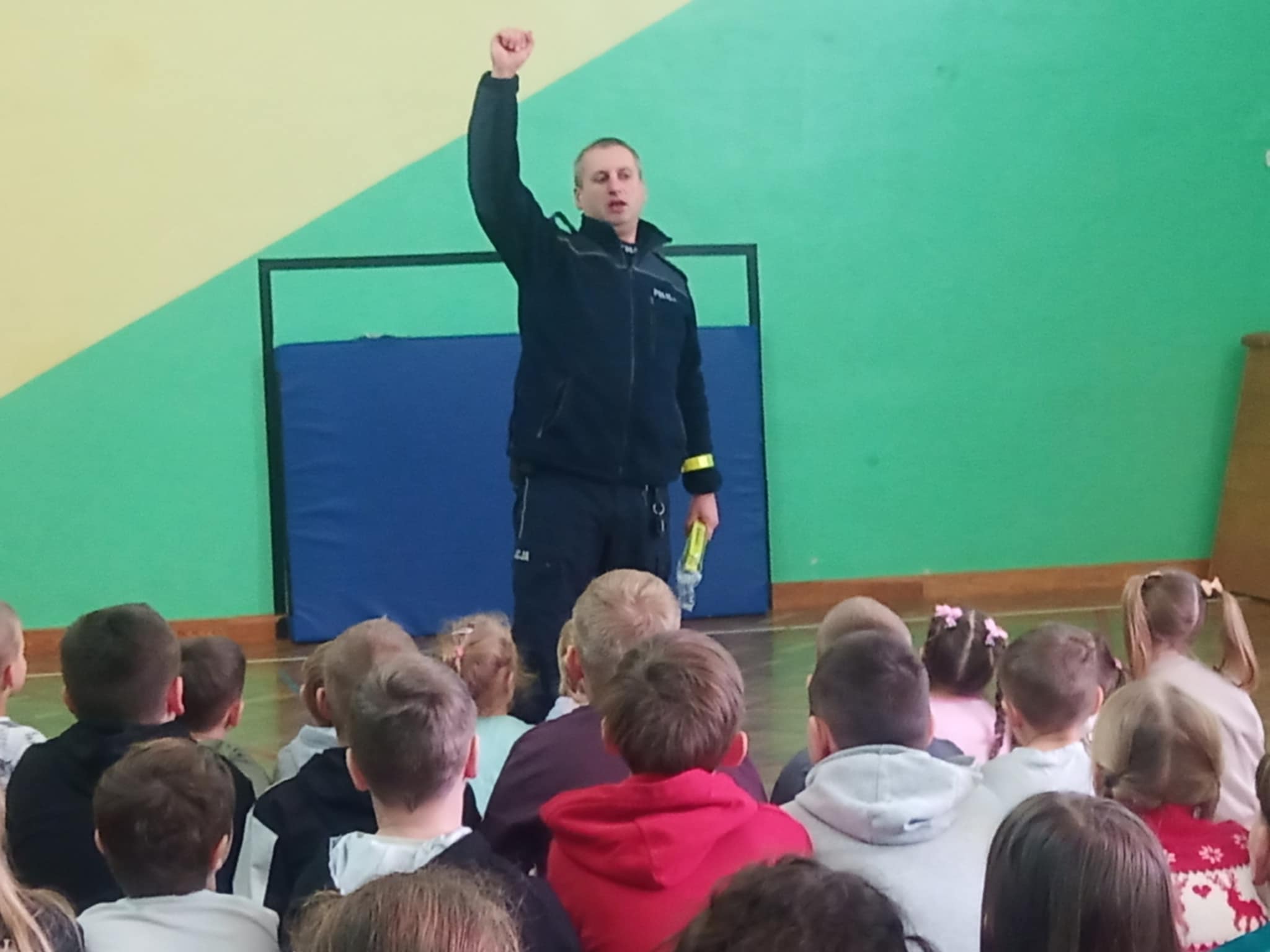 Pan Policjant w bardzo przystępny i ciekawy sposób przypomniał dzieciom najważniejsze zasady bezpiecznego spędzania wolnego czasu w okresie zimowym.