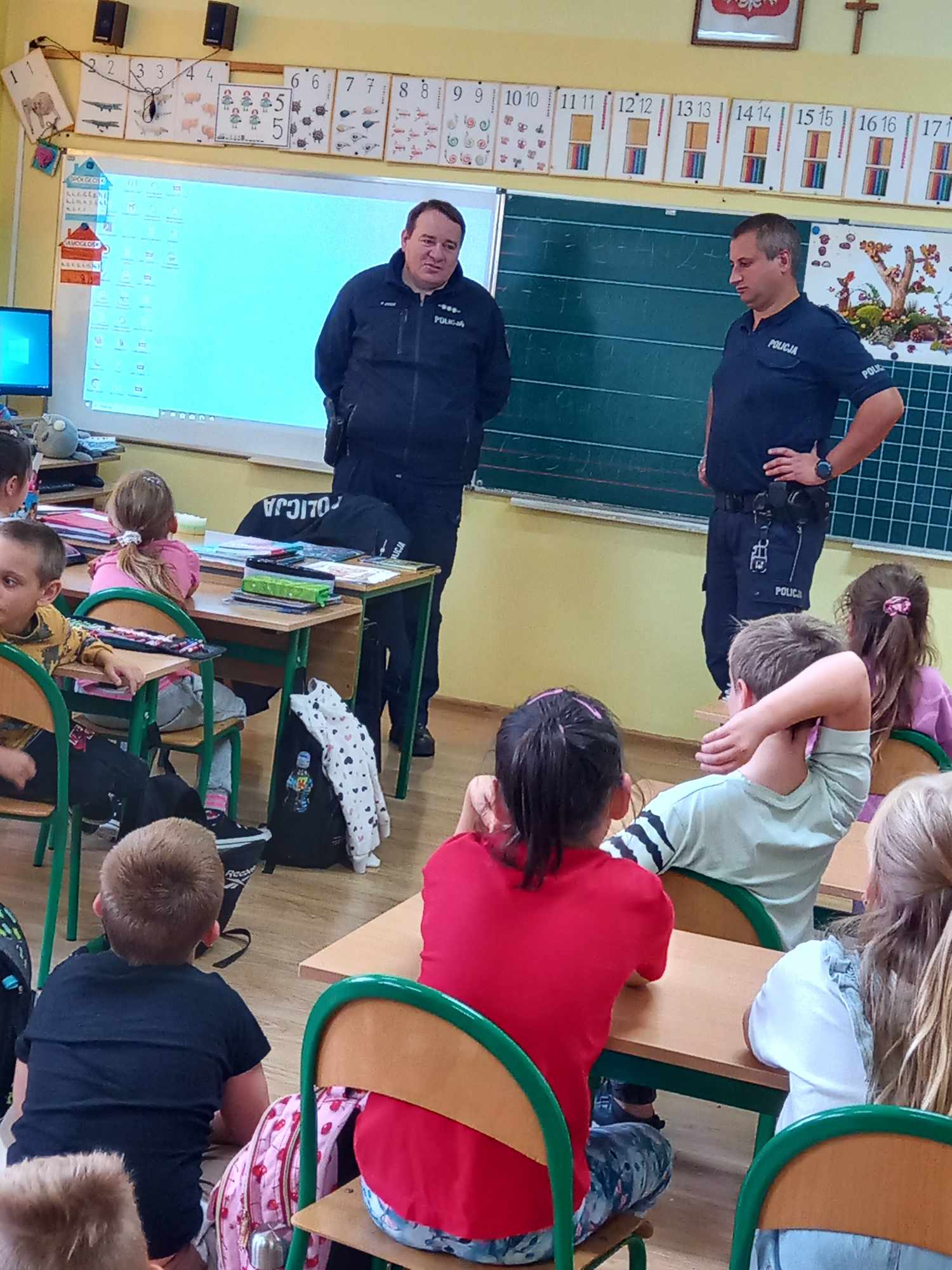 4 października w Naszej Szkole odbyło się spotkanie z policjantami. W spotkaniu uczestniczyły dzieci z klas I-III. Uczniowie w czasie oglądania filmu edukacyjnego razem ze Sponge Bobem poznawali i przypominali sobie najważniejsze zasady bezpiecznego korzystania z ruchu drogowego.