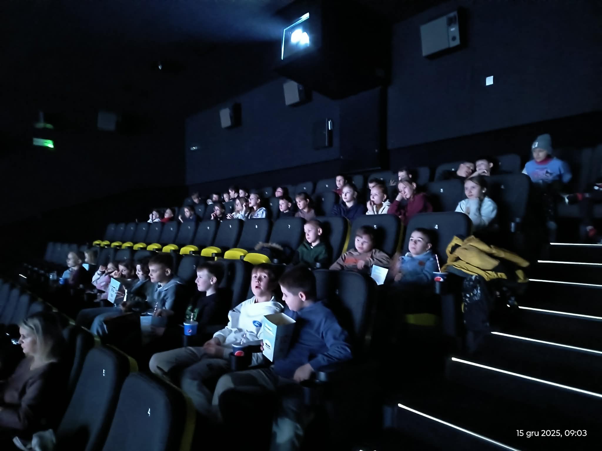 Pierwszym punktem wyjazdu była wizyta w kinie Helios i udział w projekcji filmu animowanego pt. „Mikołaj i ekipa”. Uczestnicy zasiedli w fotelach kinowych i na początku obejrzeli i wysłuchali prelekcji dotyczącej sprawiania ludziom radości oraz uczestniczyli w zabawach i quizach związanych ze zbliżającymi się świętami i tym co powinno być podczas ich trwania najważniejsze, czyli dzielenie się, dobre uczynki, komplementy, dawanie prezentów od serca, pomoc. Po wstępie rozpoczął się seans filmowy, podczas którego widzowie śledzili losy Super- Mikołaja i jego przygody w świecie pełnym konsumpcjonizmu, gadżetów i zabawek. Mikołajowi towarzyszył elf, renifer i dziewczynka o imieniu Billie, którzy razem musieli przeciwstawić się nikczemnemu właścicielowi fabryki zabawek. W filmie ukazano również bardzo aktualny problem, jakim jest zaspakajanie potrzeb dzieci przez dorosłych jedynie w formie materialnych nowinek technicznych, kosztem czasu spędzonego razem. To co nasuwało się po obejrzeniu filmu, to samotność dziecka w domu, w którym jest wszystko oprócz rodziców, gdyż ci są zapracowani i zajęci realizacją swoich celów. Film na pozór świąteczny, poruszył aktualny problem współczesnych rodzin.